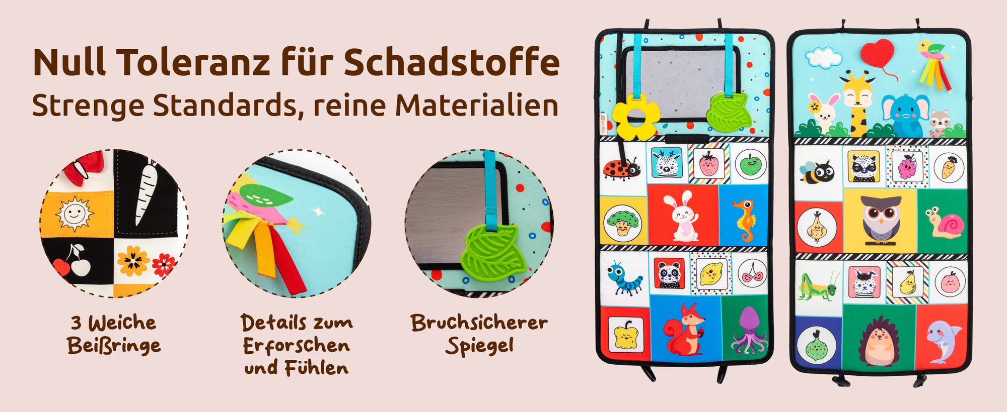 Unser Mirror Toy besteht aus bruchfestem Acryl-Spiegel für maximale Sicherheit, kombiniert mit weichem Filz und BPA-freiem Kunststoff – perfekt für kleine Entdecker.