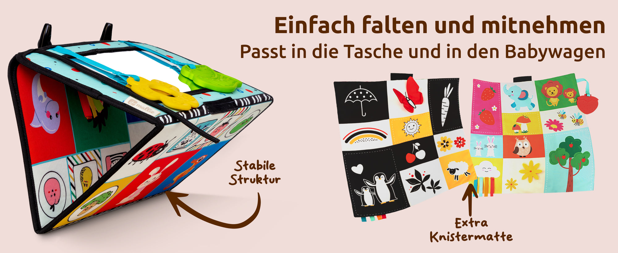 A: „Wir haben’s oft auf der Krabbelmatte oder an die Wand gelehnt. Es hat auch so eine Halterung, damit man’s aufhängen kann. Zusätzlich kann man das auch so hinstellen wenn man es faltet. Ich variiere die Position, damit das Baby immer was Neues zu sehen hat.“