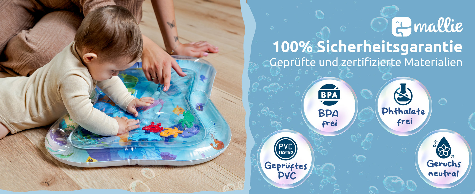 Unsere Wassermatte besteht aus 100 % BPA-freiem PVC, das sicher für Babys und frei von schädlichen Weichmachern ist. Das robuste Material sorgt für langanhaltenden Spielspaß und ist einfach zu reinigen.