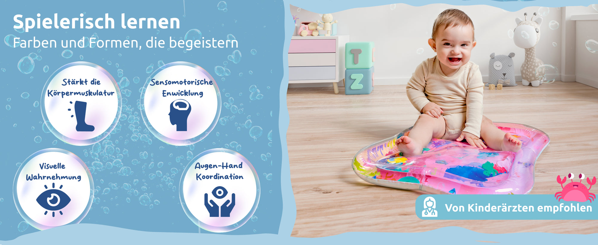 Unsere Baby-Wassermatte ist das ideale Spielzeug für kleine Entdecker ab 3 Monaten. Sie fördert die Bauchlage, stärkt Nacken- und Rückenmuskeln und regt durch schwimmende Figuren zum Greifen an.